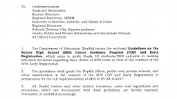 SENIOR HIGH SCHOOL CAREER GUIDANCE PROGRAM AND EARLY REGISTRATION By deped_admin posted on September 10, 2015 The Department of Education (DepEd) issues the enclosed Read More